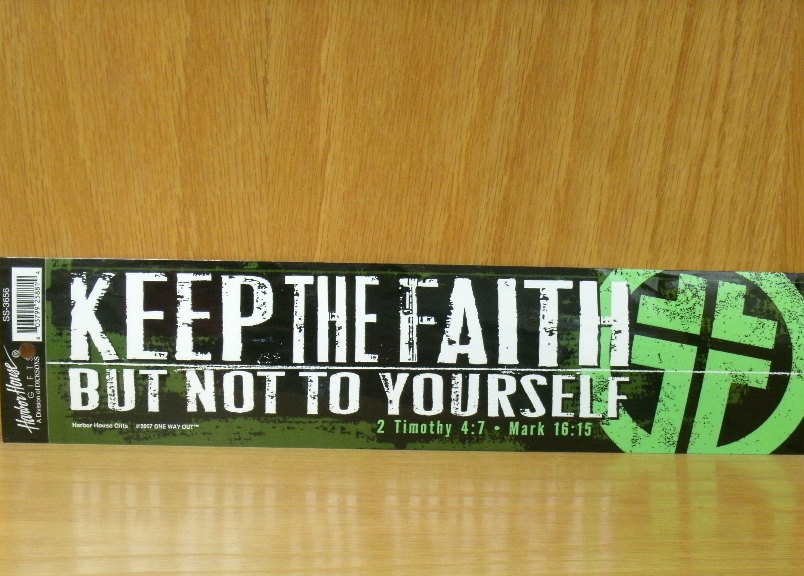 Bumper Sticker with Christian message in white: “Keep the faith, but not to yourself.” Graphics consist of Green cross in a green circle, on a black and green background.