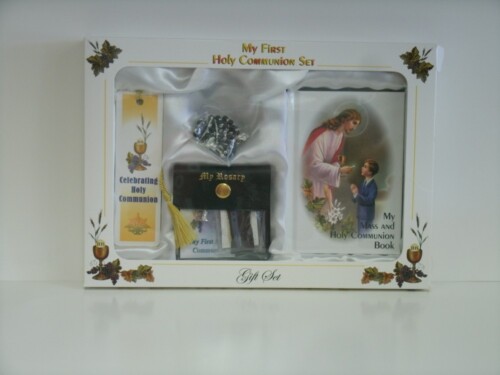 Hardcover Mass book with a brilliant depiction of the Holy Eucharist on the Altar, with a Roman missal behind it, flowers on the altar, and an aura of light around the Eucharist. Mass book has order of the mass, how to pray the rosary, prayers and life of Jesus in pictures.