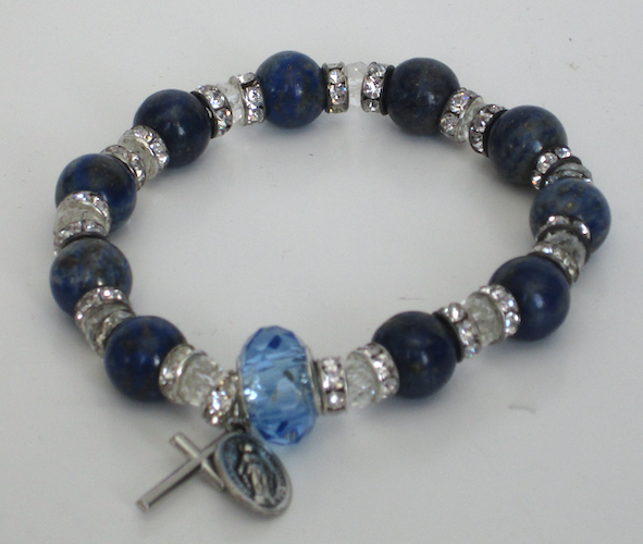 Stretchy bracelet with four styles of beads 15mm – 5mm, with crucifix and Miraculous medal. Gift boxed.