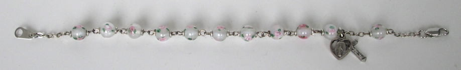 White beads with pink rose, with crucifix and Miraculous Medal. Gift boxed