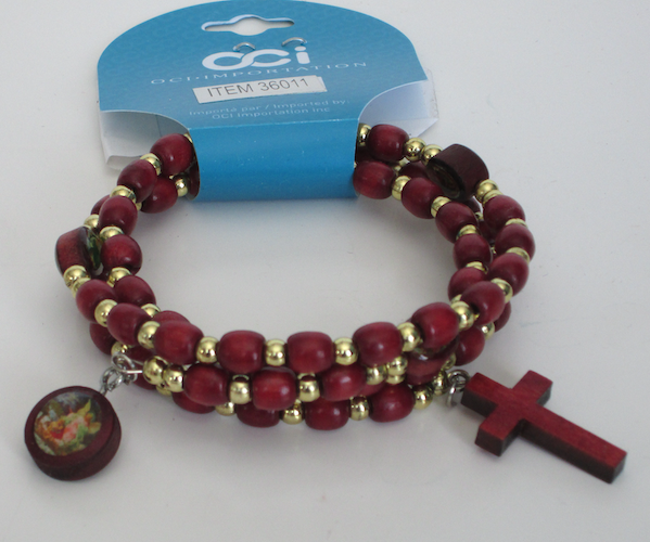 Wood bracelet on wire with plane cross, Guardian Angel bead and saint beads at Our father/Glory Be.